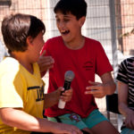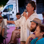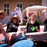 Besonders war die Rotation, die eine flache Hierarchie ermöglichte. Menschen aus dem Publikum, die sich gleichzeitig aus Vertreter*innen eines Mediums zusammensetzten, bestiegen die Bühne und gingen nach einem dialogischen Input zurück ins Publikum. Wie es sich für einen Familienplatz gehört, sprangen unter, neben und auf der Bühne Kinder herum. Das allein machte es unmöglich, dass sich ein lahmes, lektorierendes Vortragsniveau einschlich. Eine nicht zu vernachlässigende Dimension war die räumliche Strukturierung des Platzes. Das Brunnenmobil, ein Transporter, der sich zu einer Stage transformieren lässt, bildete die Hauptbühne, etwas versetzt daneben fand sich unter Sonnenschirmen das DJ-Pult und schräg gegenüber war eine kleinere Bühne aufgebaut. Durch die abwechselnde Bespielung der Bühnen war es möglich, zusätzliche Abwechslung und eine Lebendigkeit der verschiedenen Inputs zu garantieren.