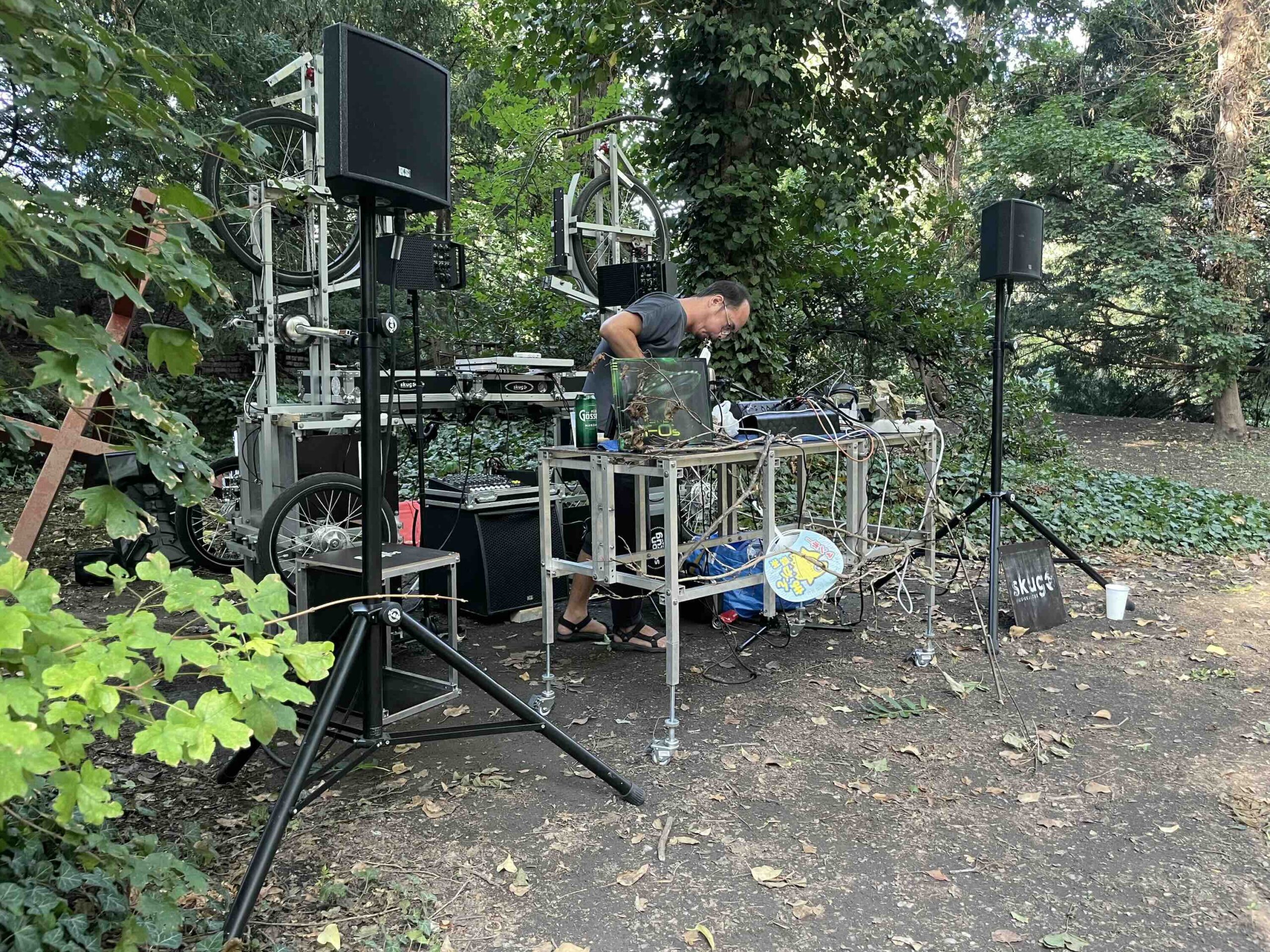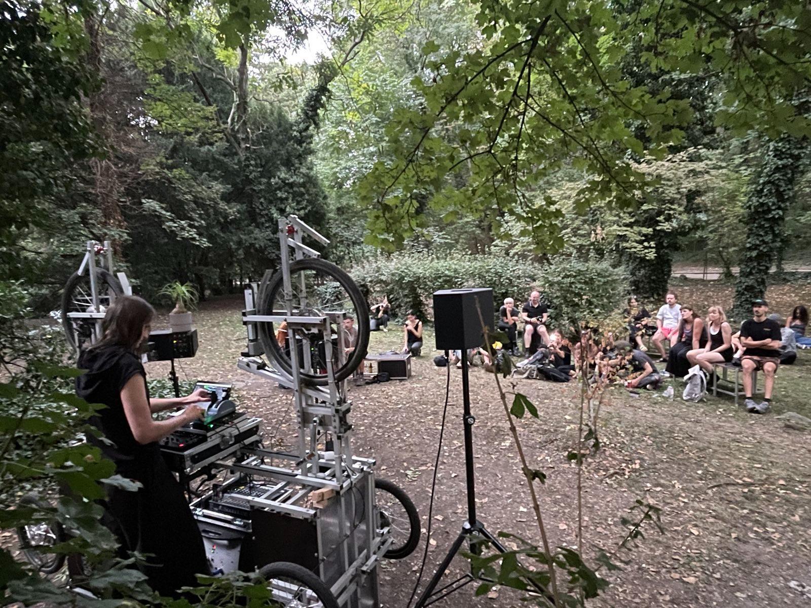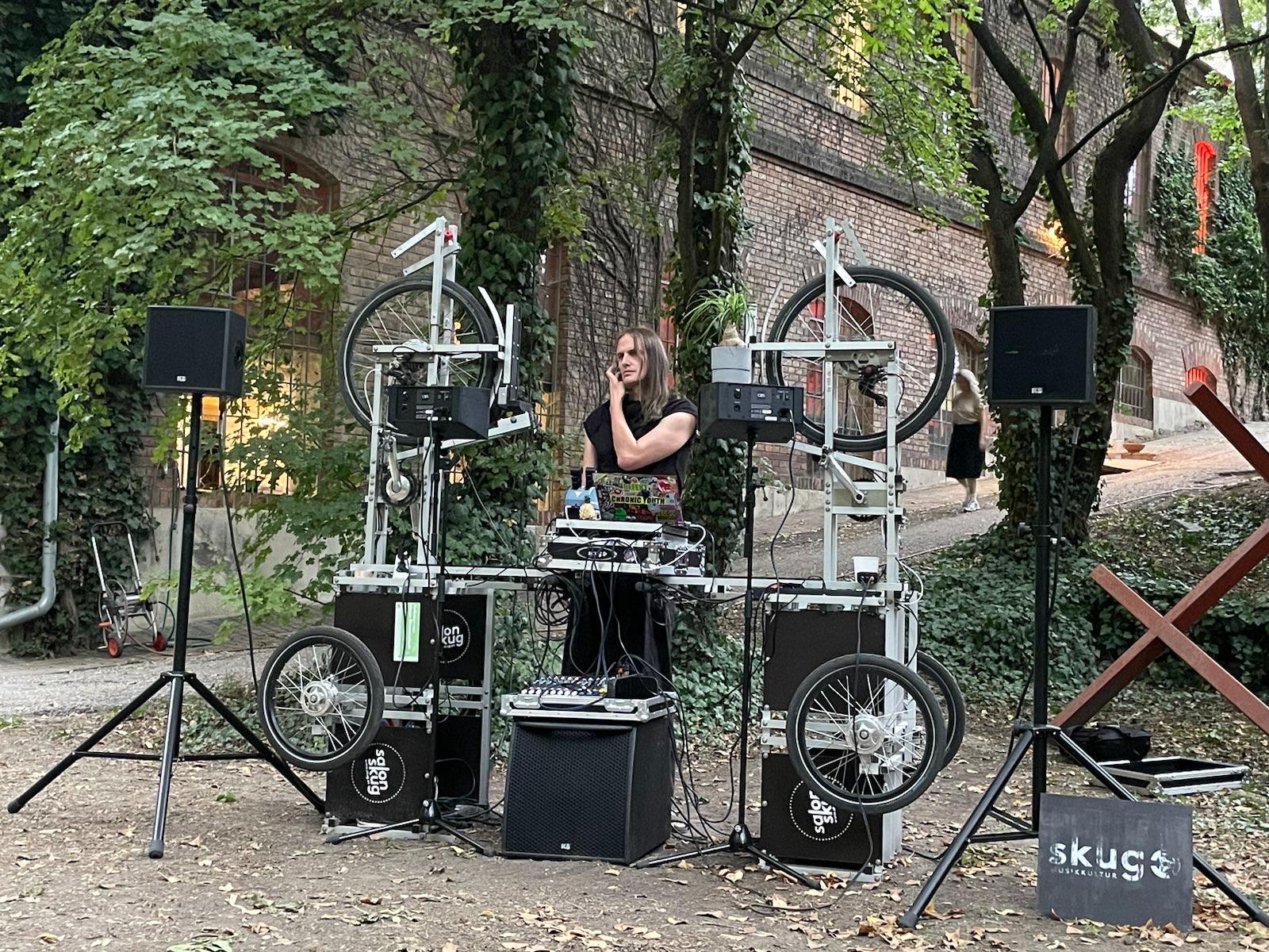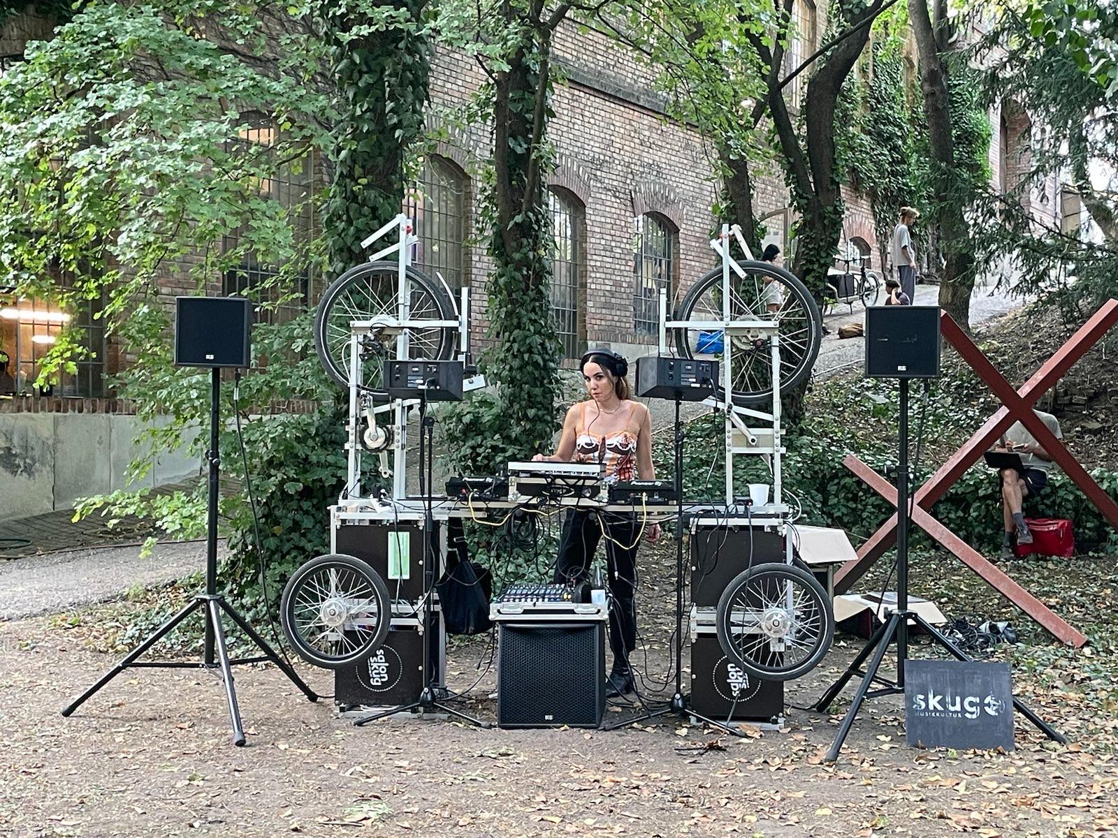 Am Donnerstag eröffnete Spur B, aka David Baum, das Festival. Der Resident-DJ des Salon skug war maßgeblich an der Umsetzung der Kooperation beteiligt. Platzwahl und Präsentation der Räder gehen auf sein Konto. Entsprechend passte David sein Set auch an die Location an. Wie der Soundtrack eines Arthouse-Films erfüllten zurückhaltende Klänge den Garten der Zacherlfabrik. Ein leises Knistern, abstrakte Geräusche und atmosphärische Beats erlaubten den Ankommenden, in Stimmung zu kommen – und genauer hinzuhören.