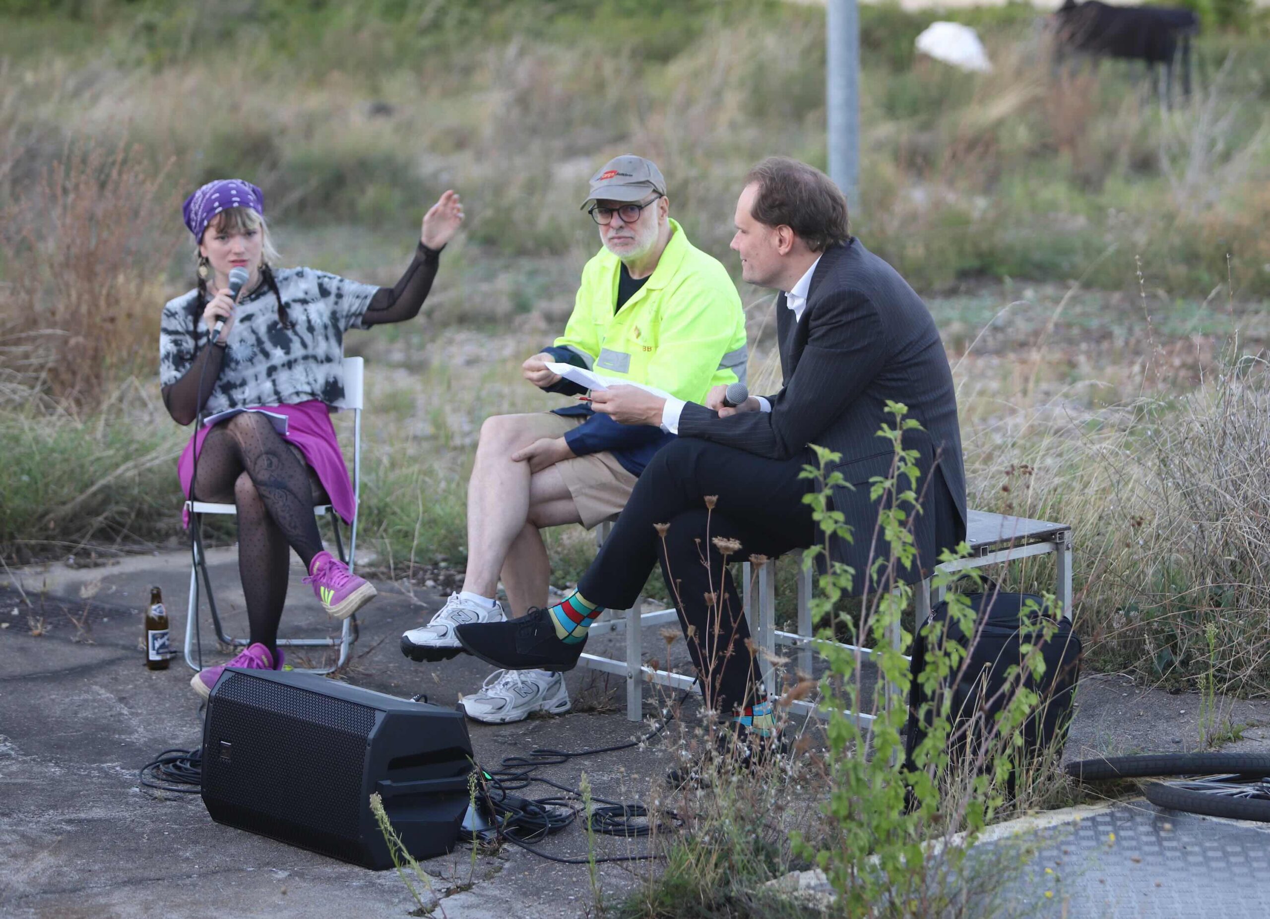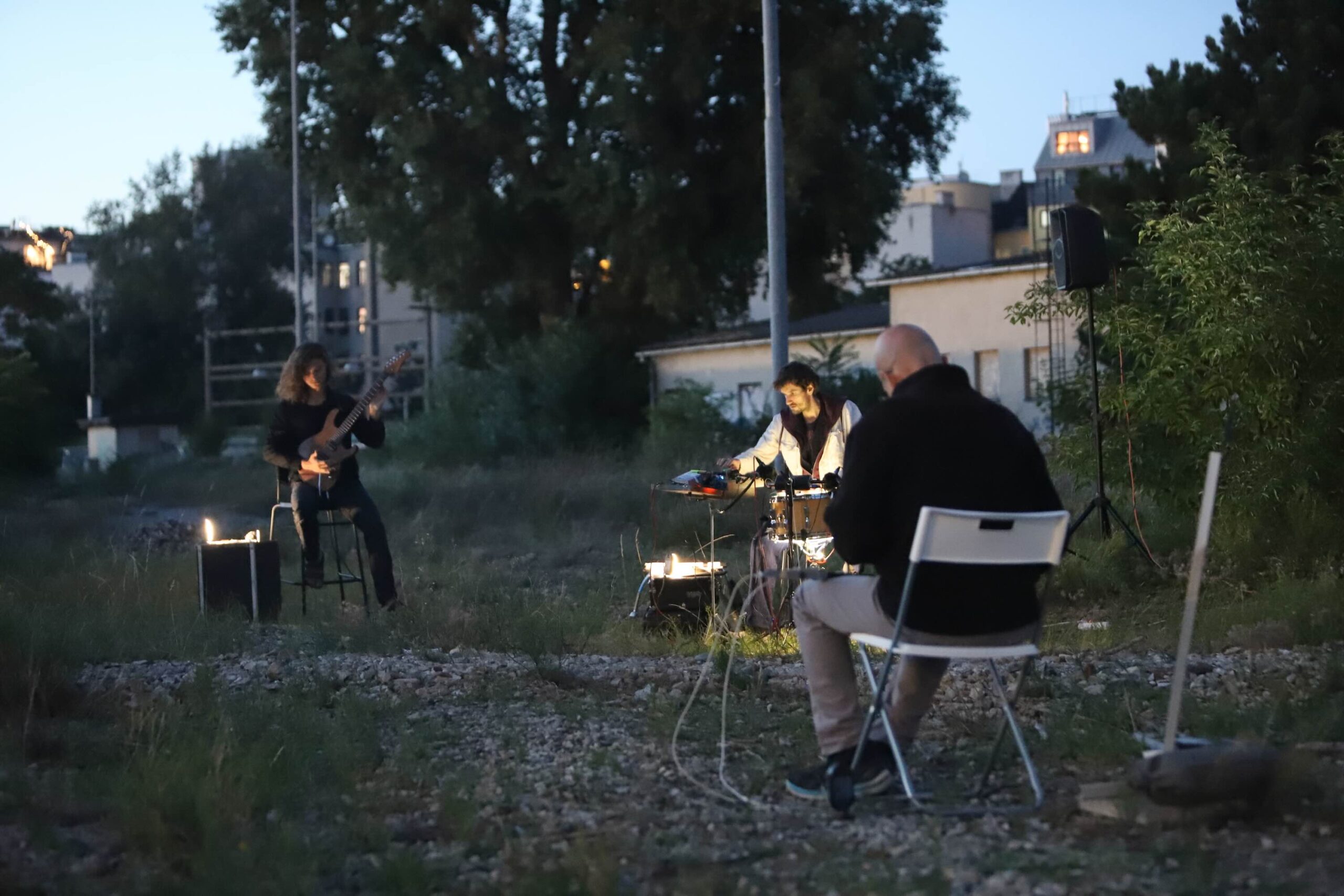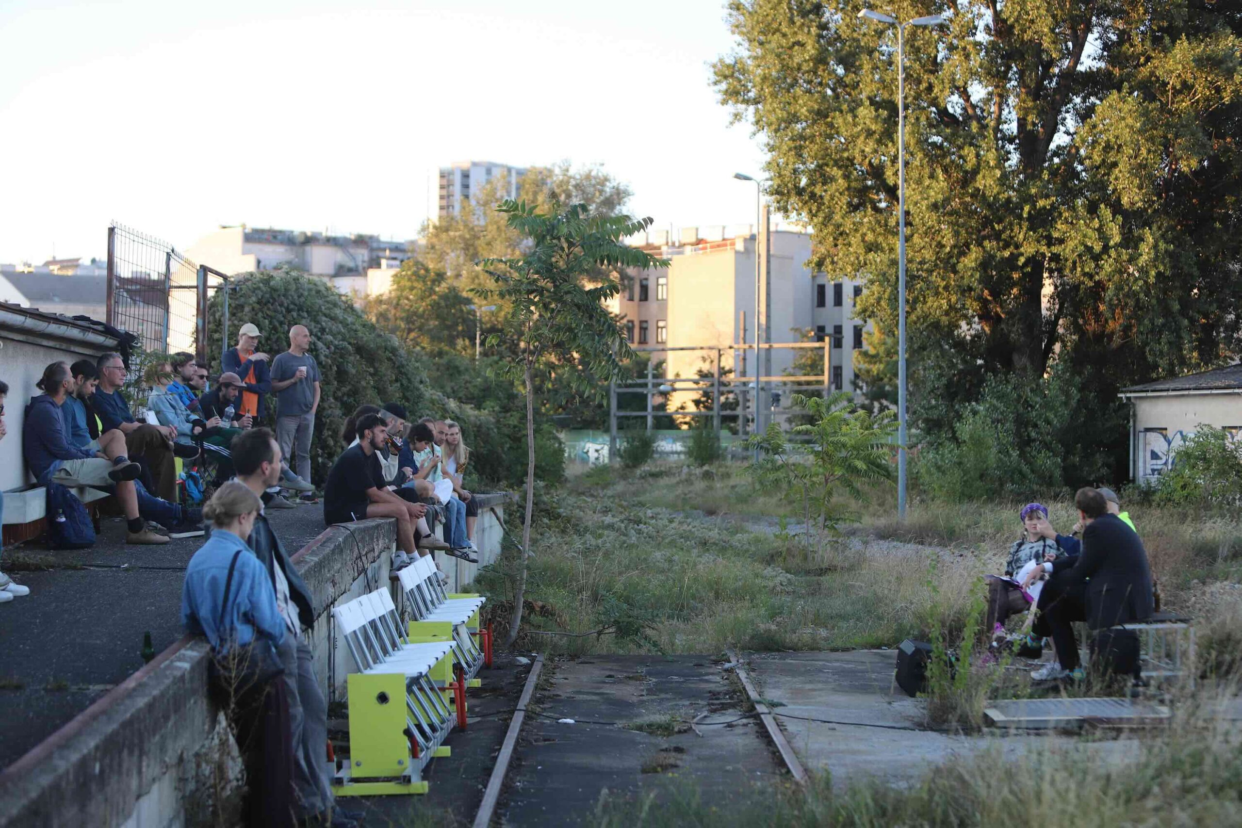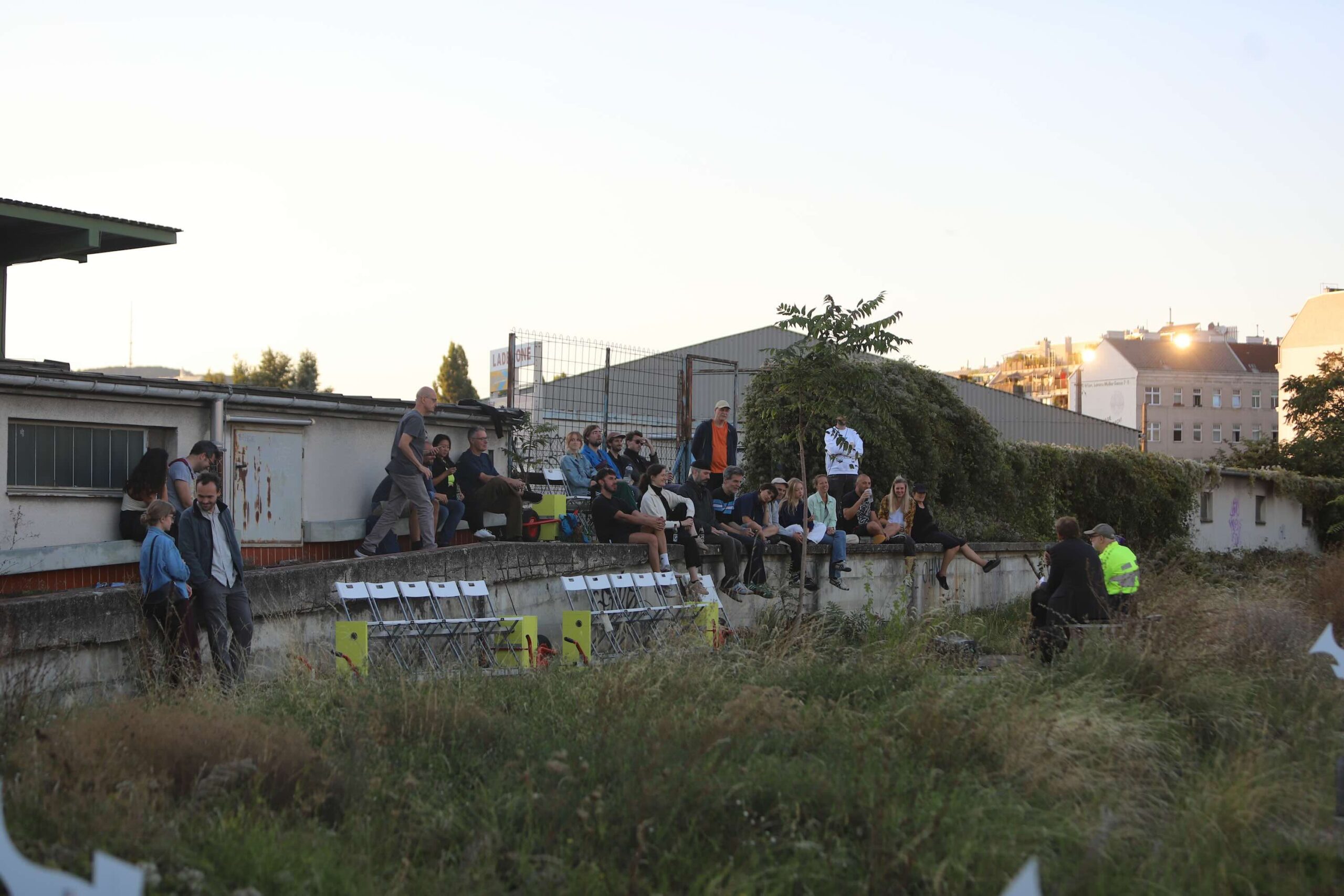 Man steht da mit Bier in der Hand, Sonne tief, alles flackert. Eine Bühne neben Büschen, Kabel über Kies, das Publikum zwischen Performance und Performanz. Es ist dieses Wien-Gefühl, das »Eh cool« sagt und »Was machen wir hier eigentlich?« denkt. Michael Zinganel sitzt vorne, mit entspannter Stadtforscher-Arroganz, die nur Menschen haben, die Begriffe wie »Infrastruktur als Gedächtnisstruktur« ohne Ironie sagen können. Und doch: Er hat recht. Während er redet, rauscht ein Zug vorbei – in Gedanken, natürlich. Es ist ja alles flüchtig hier: die Tankstelle, der Abend, sogar der Stromanschluss.