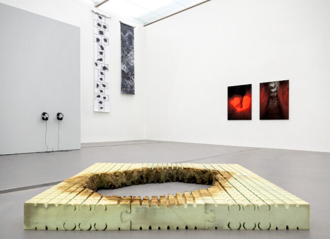 Direkt davor, in der Mitte des Raumes, liegt Sergey Bratkovs quadratische Schaumstoffstruktur mit einem beträchtlichen Loch auf dem Boden und hält die Betrachter*innen gefangen, indem es den Assoziationen freien Raum lässt, diesen aber zugleich physisch dominiert. An einer anderen Wand hängen zwei in Rot getauchte Fotografien von Ihor Okuniev; man erkennt nicht viel, etwas Erde, ein Büschel Gras vielleicht – und das reicht auch schon. Die beiden Fotos sind tatsächlich nur der visuelle Teil der Arbeit »Fields«, in deren Zentrum eine zehnminütige Toncollage steht (hörbar mittels Kopfhörer), die ganz im Sinne von Iannis Xenakis komponierte Klangräume mit Tonaufnahmen kombiniert, in denen der im Hintergrund deutlich wahrnehmbare Krieg eine bedrohliche Kulisse bildet. Die Tonebenen funktionieren nicht nur als Soundtrack für die beiden Fotografien, sondern auch für Lesia Vasylchenkos Arbeiten »Night« und »Tachyoness«, zwei filmische Rekonstruktionen über viele Jahrzehnte ukrainischer Nacht bzw. Morgendämmerung. Vasylchenko schlägt damit eine Brücke zur langen Vorgeschichte russischer Aggression gegen die ukrainische Bevölkerung, Sprache und Kultur bereits vor dem Angriff auf die Ukraine 2022.