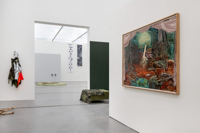 Im zweiten Raum der Ausstellung findet sich dann mehr Farbe, deren Pracht jedoch auf ganz unterschiedliche Art und Weise bricht. So lassen Anca Benera und Arnold Estefán in »Rehearsals for Peace« ihre Protagonistin in einem bunten Kostüm – Leuchtfarben kombiniert mit Camouflage – durch eine ausladende Videoinstallation tanzen, um Frieden zu beschwören. Die Arbeit bildet einen spannenden Kontrast zu den minimalistischen Arbeiten, die ansonsten in der Schau zu sehen sind. Diese schöpfen ihre Kraft manchmal aus einer subtilen Assoziation, die sich erst bei genauerer Betrachtung erschließt; wie etwa im Fall von Elena Kristofors »Wie eine Geranie rot«. Auf einer breit ausgerollten Stoffbahn hat die Künstlerin rote Geranienblüten zerdrückt, die auf den ersten Blick wie Blutstropfen wirken. Die beigefügte Information, dass »Geranie« auch der Name einer russischen Angriffsdrohne ist, lässt dem*der Betrachter*in das Blut in den Adern gefrieren.