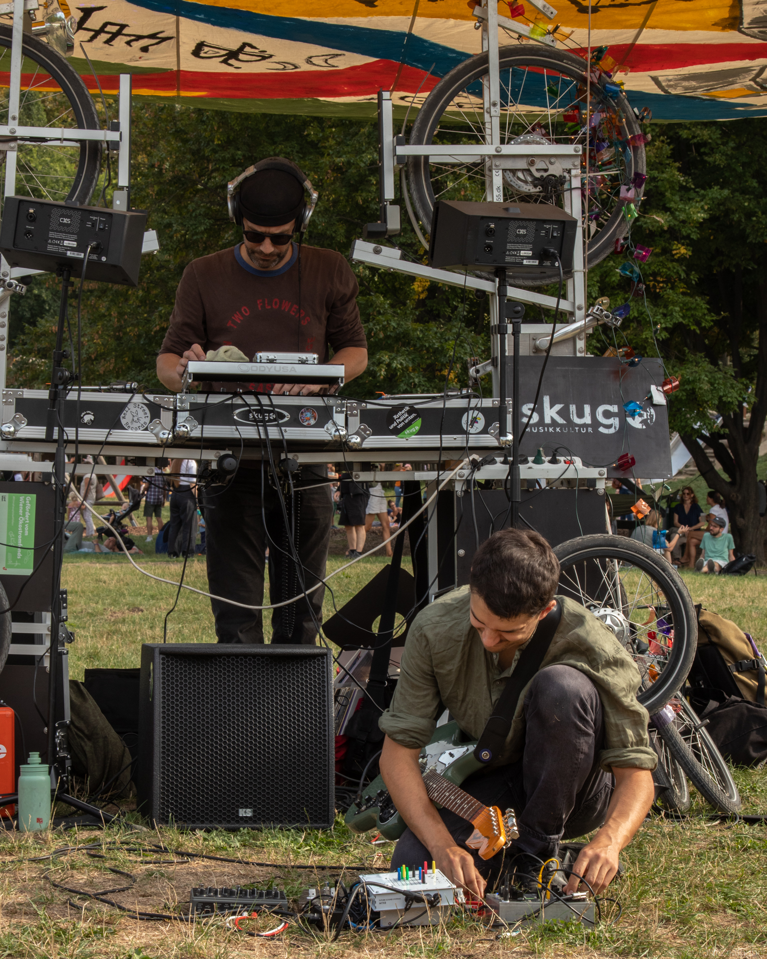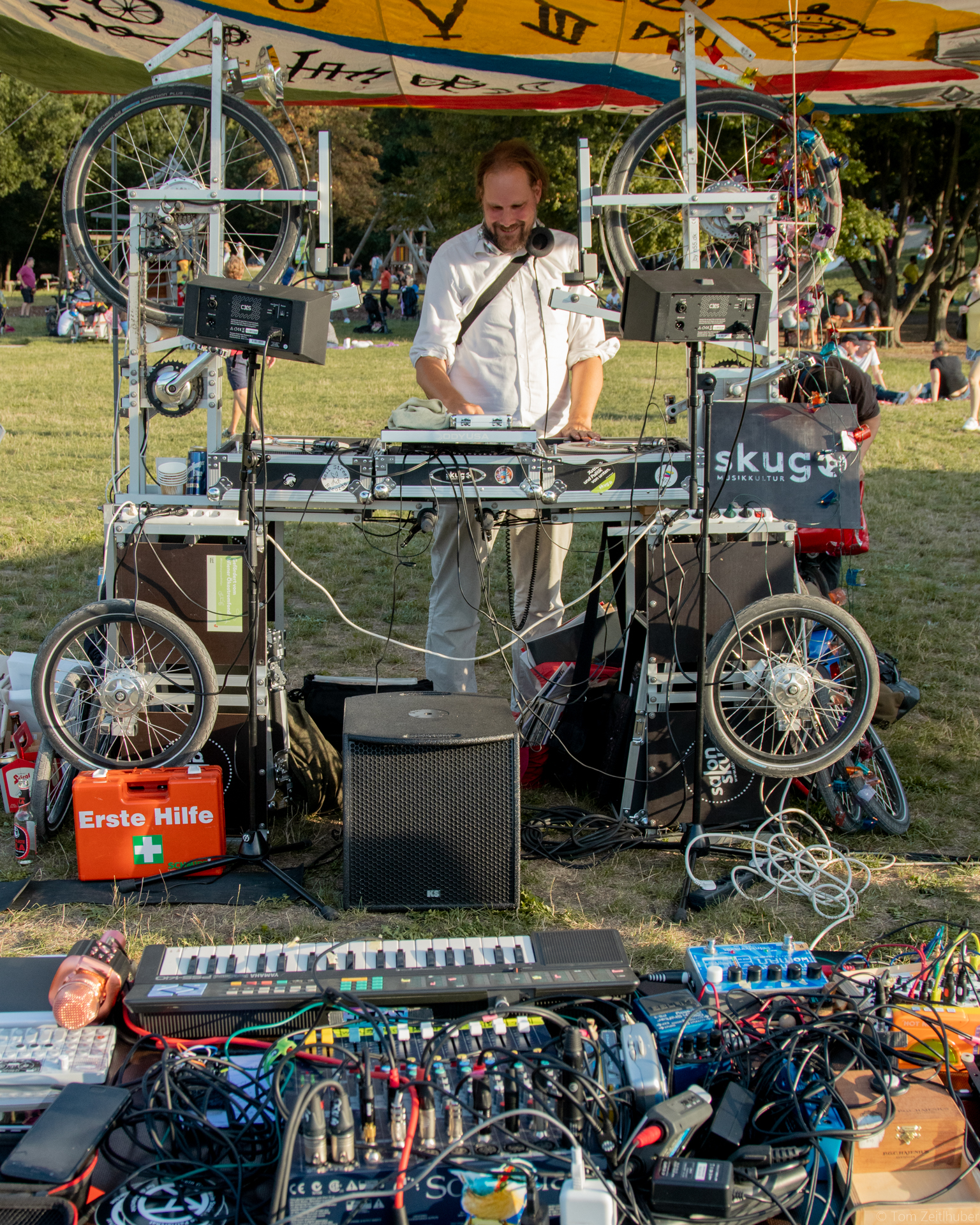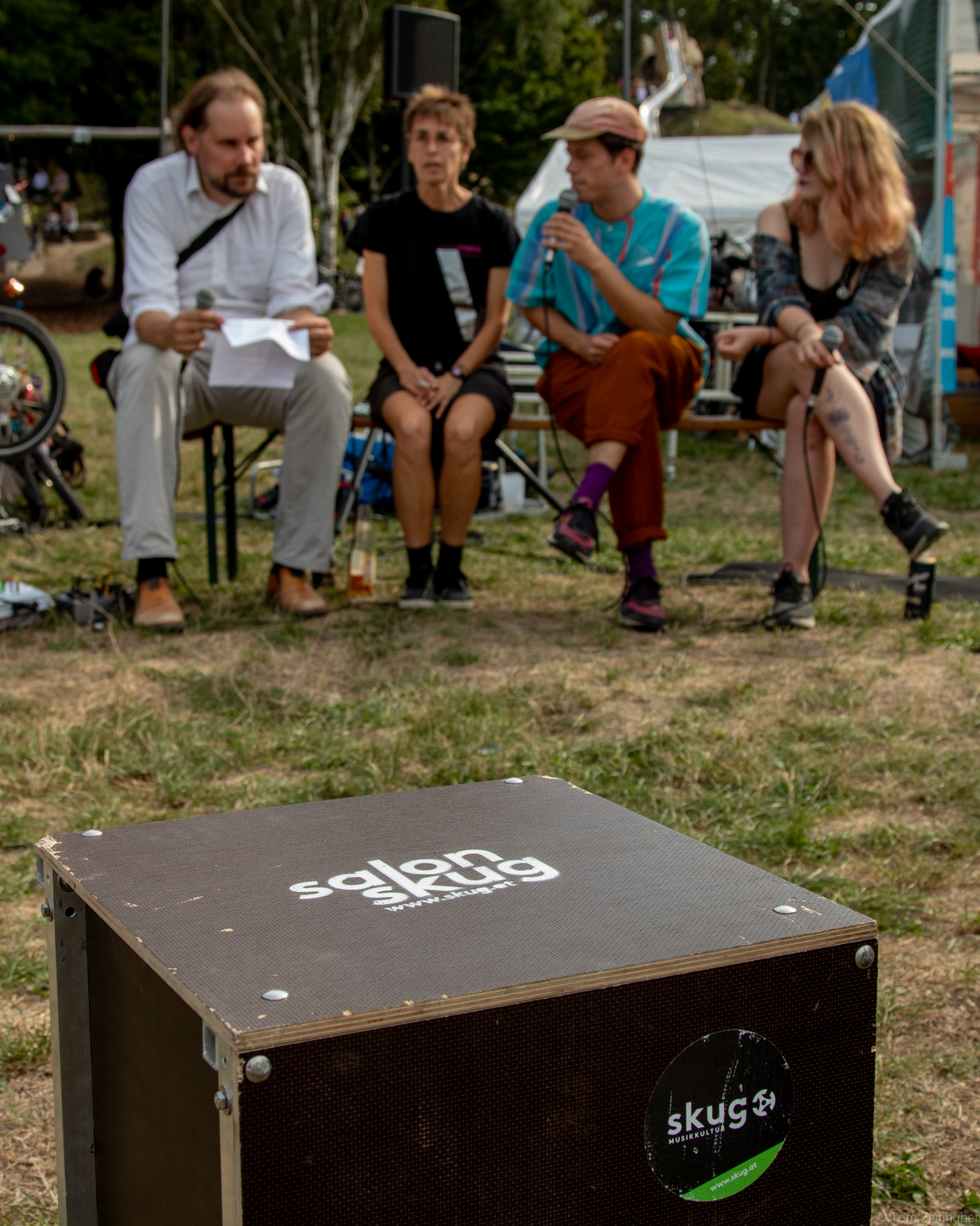 Der Salon skug auf Rädern ist bekanntlich eine mobile Veranstaltungsplattform, die an öffentliche Orte der Stadt jenen Sound und jene Debatte bringt, die dort nicht unbedingt erwartet werden. Dies zur Freude der Passant*innen (und meist auch der Anwohner*innen). Auf dem ohnehin schon ausgezeichnet besetzten Volksstimmefest mit seinen sorgfältig und gut kuratierten Live-Shows haben wir ein Eckchen am Ende kurz vor Waldesrand bezogen und dort ein bisschen Sounds ausgesät, die die einen oder anderen Besucher*innen zu einem »Aha, okay, das also auch noch« verleitet haben. So ist das eben beim letzten Stand ganz links. Wir liefern mit Freuden und kommen nächstes Jahr gerne wieder. Wer es verpasst hat, hier zumindest die Fotostrecke zum Schwelgen.