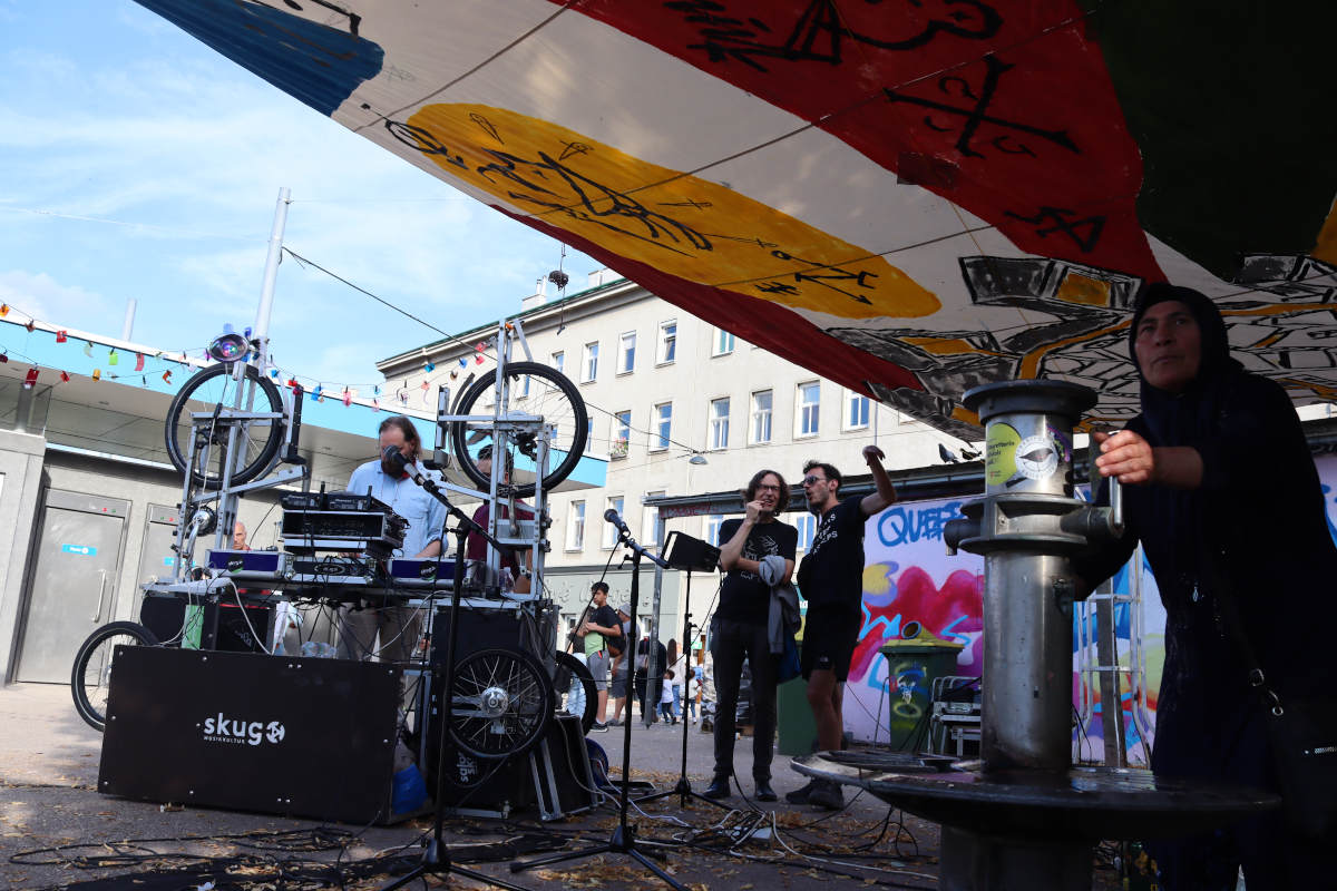 Es diskutierten Roland Romano, Sprecher der Radlobby Österreich; Martin Winkelbauer, Verkehrssicherheitsexperte und Gutachter; Luise Wernisch-Liebich, Zukunftsrat Verkehr; Philipp Haller, Künstler und Historiker. Moderation: Ania Gleich (skug) und Frank Jödicke (skug), Ton: Khachick Danho.